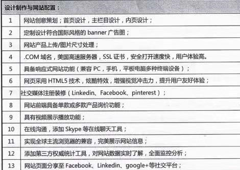 设计制作与网站配置讲的是网站设计这个版块,也是最重要的版块,毕竟我们是在寻找外贸建站的服务。这个部分有13个服务项,数量上肯定绝对占据优势了,接下来我们对每一项进行推敲。